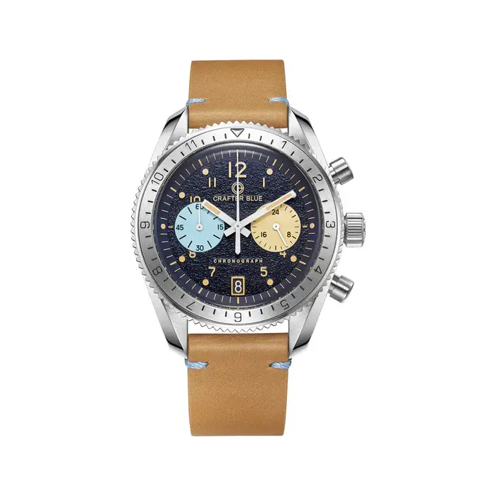 Crafter Blue introduces the Bon Voyage Macaron Super Chrono, a stylish and functional addition to their lineup. This watch features a vibrant macaron-colored dial housed in a robust 42mm stainless steel case with a sapphire crystal, ensuring durability and clarity. Powered by a precise quartz chronograph movement, it offers a practical and reliable timekeeping solution. With 100 meters of water resistance and a comfortable genuine Italian strap, this timepiece is perfect for both adventures and everyday wear.
