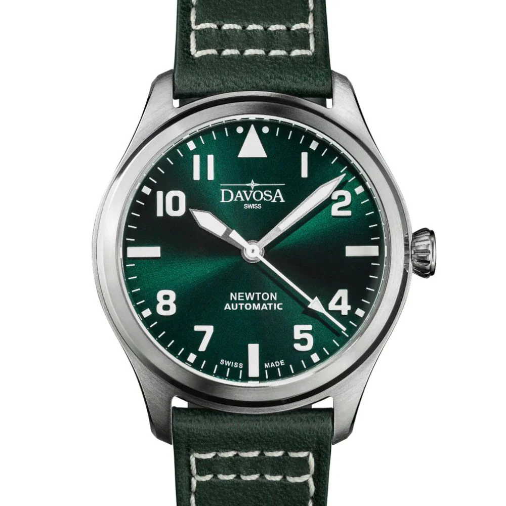 The DAVOSA Newton Pilot Automatic captures the spirit of classic aviation timepieces, blending sleek aesthetics with top-tier functionality. Powered by the DAV 3021ND Swiss automatic movement, this 40mm watch offers a balanced dial with a sunburst finish, marked with Arabic numerals and SuperLumiNova BG W9 for night-time readability. The rugged cowhide strap and grip-friendly conical crown complete the pilot-inspired design, ensuring durability and ease of use. With a 40-hour power reserve and a skeletonized rotor visible through the glass back, the Newton Pilot delivers precision and style in equal measure.