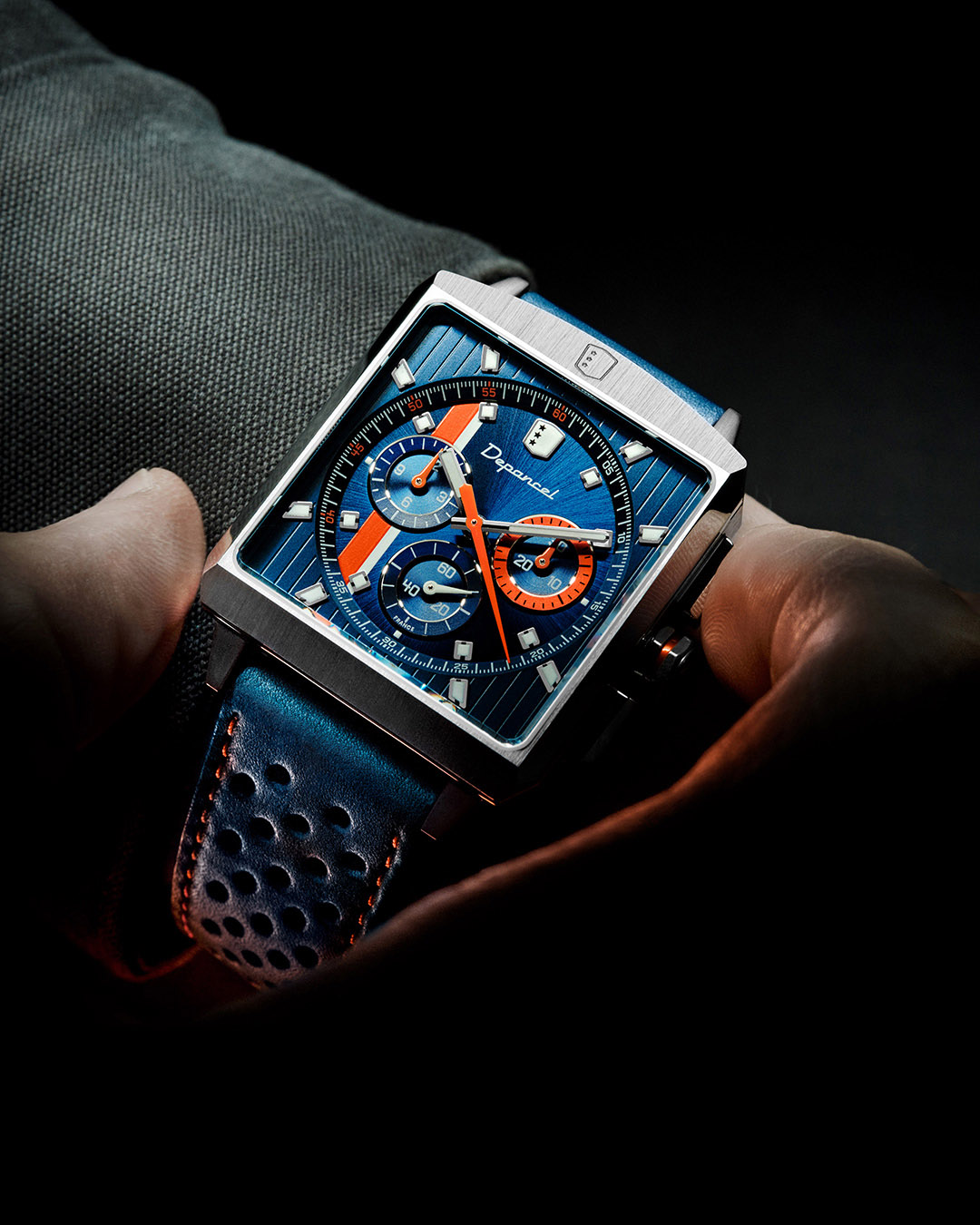 Depancel’s Série-R Chronograph Tangerine is a vibrant tribute to motorsport, featuring a 40x36mm 316L stainless steel case, a Peacock SL-4801 automatic movement with a 60-hour power reserve, and a sapphire crystal. The watch boasts a unique two-tone orange and blue design with a vertically striped tangerine dial and chronograph functions. It is water-resistant up to 50 meters and comes with a blue racing leather strap with orange stitching. Priced at €829, it’s limited to 300 pieces, available for delivery in December.