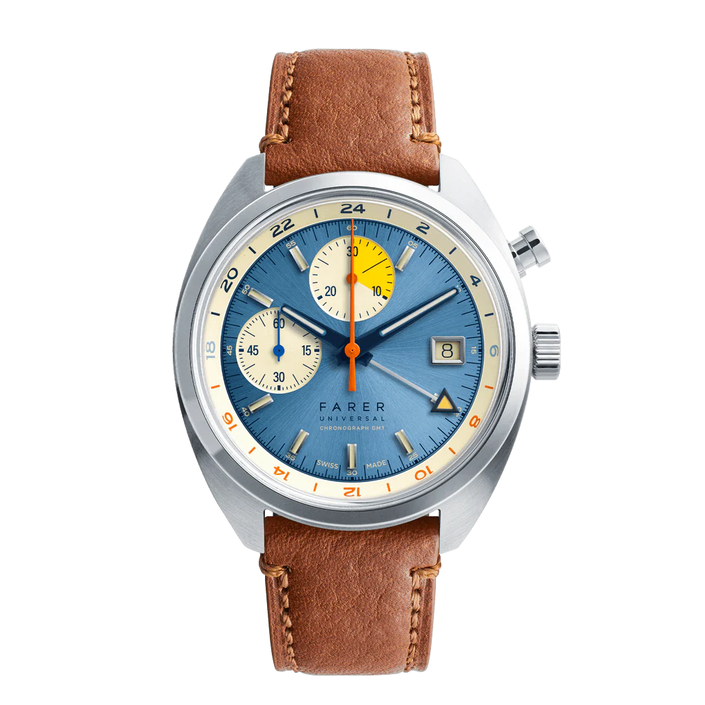Dive into sophistication with the new Monopusher GMT watch. This timepiece features a stunning blue sunburst dial encased in 316L stainless steel. Measuring 41mm in diameter and 14.5mm in thickness, it combines style with durability. The watch is powered by the Swiss Made Elaboré Sellita SW530 M MP movement, offering a remarkable 62-hour power reserve. Water-resistant up to 100m and paired with a luxurious St Venere leather strap, this chronograph and GMT watch is a blend of elegance and functionality.