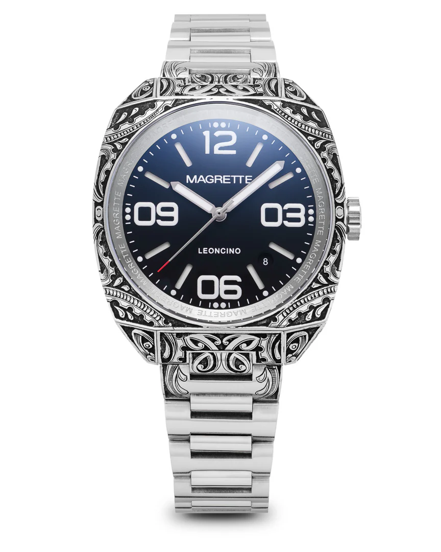 Crafted with artistry and precision, the Leoncino Wheke by Magrette offers a unique twist on luxury. Limited to just 20 pieces, this watch features an exquisite 40mm 316L stainless steel case, individually hand-engraved, paired with a double-domed sapphire crystal. Powered by the Swiss-made Sellita SW200-1 automatic movement, it provides reliability and style. With a sandwich dial construction illuminated by Old Radium-colored Swiss Super-LumiNova® BGW9, this model offers 200M of water resistance and comes with both a hand-engraved bracelet and a black leather strap.