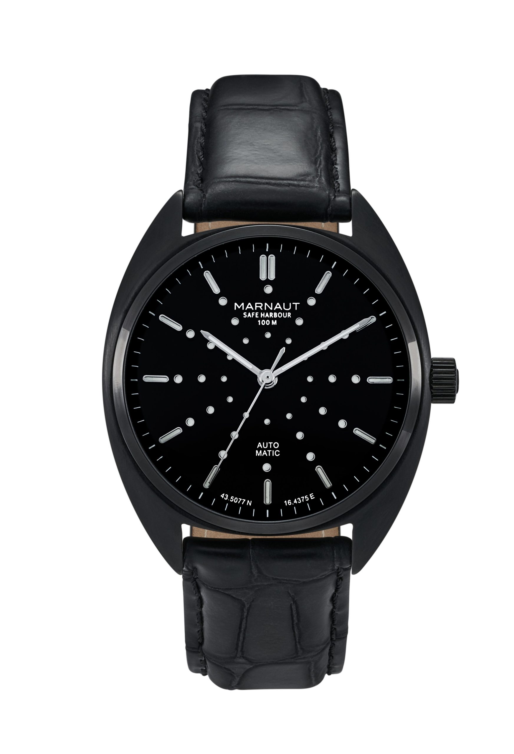 Introducing the MARNAUT Safe Harbour 100B, a refined timepiece that seamlessly blends elegance with functionality. Designed in Croatia and crafted in Germany, this watch features a 39mm 316L stainless steel case with a polished top ring, complemented by an enamel matte black dial inspired by the sea urchin exoskeleton. Powered by the Swiss Sellita SW200-1 automatic movement, it offers a 41-hour power reserve. The scratch-resistant domed sapphire crystal and SuperLumiNova C3 luminescent hands and indexes ensure clarity, while the 100m water resistance and Italian leather strap enhance its versatility.
