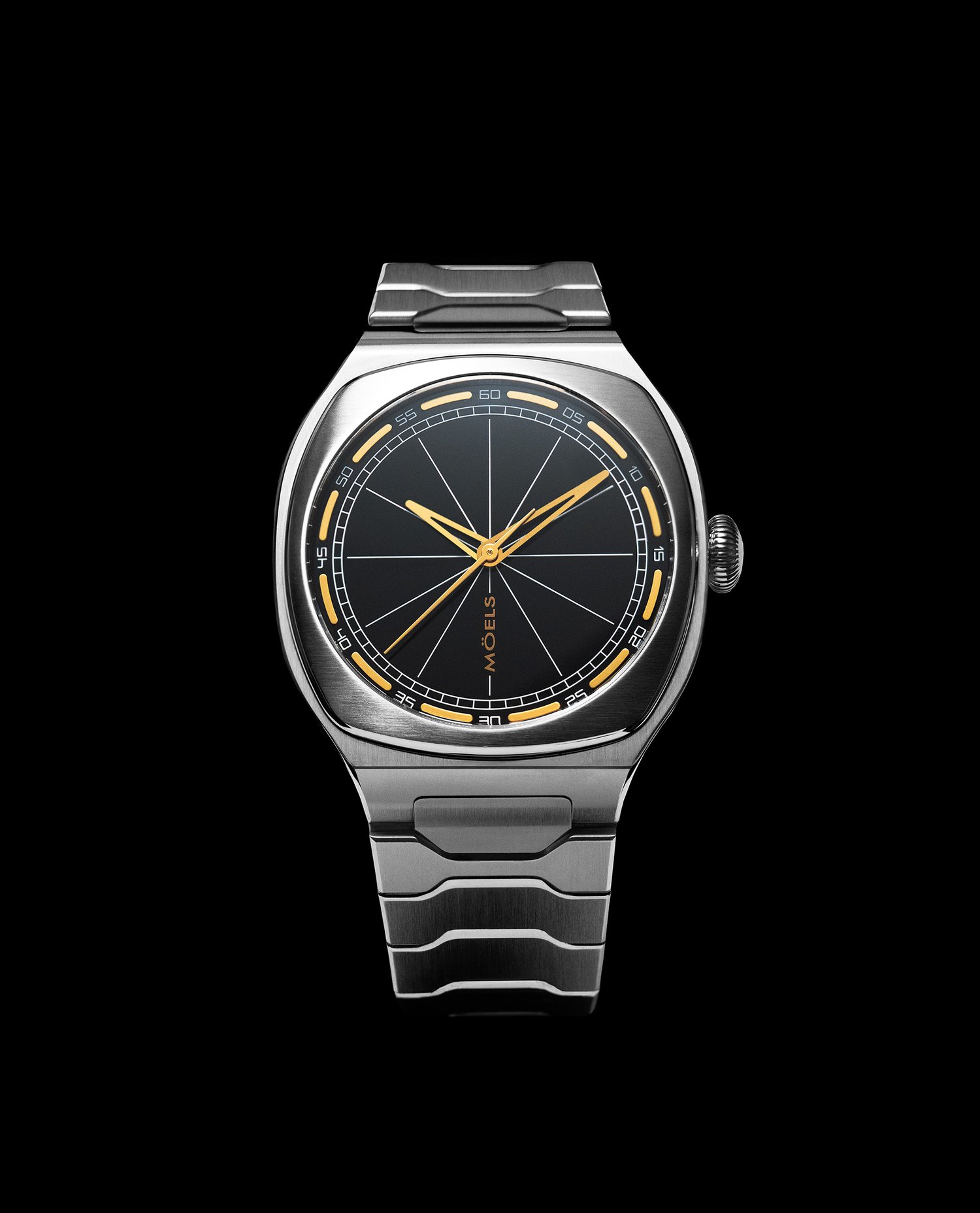 A sleek blend of elegance and functionality, the Moels & Co Darkstar captures attention with its minimalist sophistication. Housed in a 39mm surgical-grade stainless steel case, this timepiece features a satin-brushed dial adorned with gold-plated hands and markers. The double-domed sapphire crystal with inner AR coating enhances readability, while the robust Sellita SW200-1b Swiss movement ensures precision. Rated for 200m water resistance, the Darkstar combines style with resilience, making it a versatile companion for any occasion.