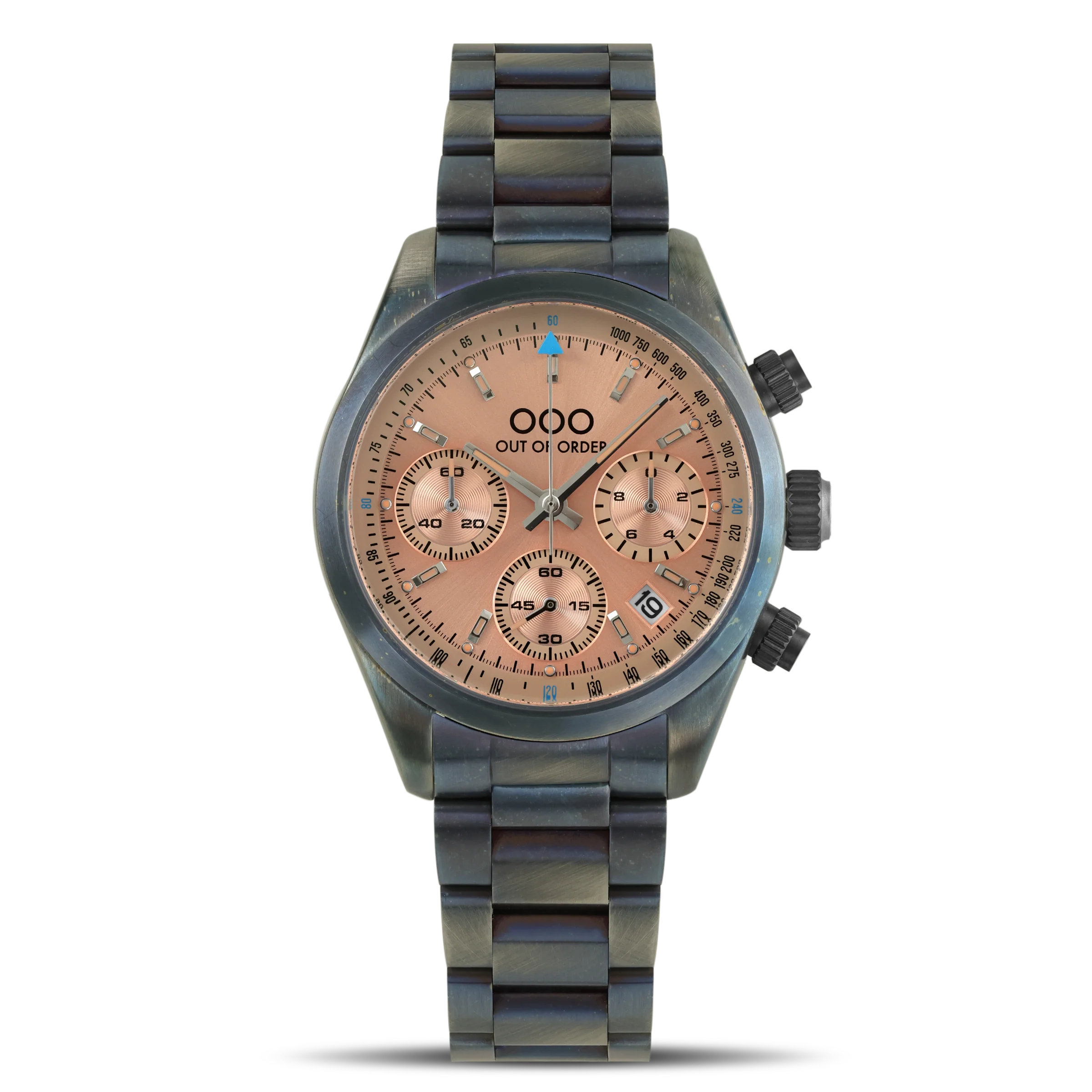 Out of Order (OOO) delivers a vintage-inspired timepiece with the Sporty Cronografo, blending modern performance and retro aesthetics. The 40mm stainless steel case with OOO’s exclusive aging process houses a Japanese Miyota 6S20 quartz chronograph movement. Its sunray peach dial, complemented by cream accents and SuperLuminova® hands, adds a stylish touch. The watch is durable with 20 ATM water resistance, flat sapphire-coated K1 crystal, and an oyster-style stainless steel bracelet.