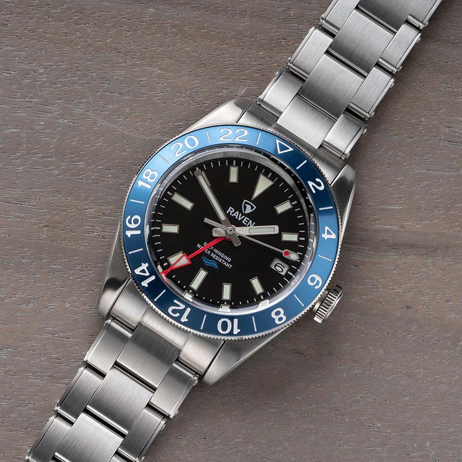 Raven’s Custom GMT Maritime offers a versatile and stylish option for travelers. This 39mm watch features a brushed and polished case with a flat top hat sapphire crystal, making it both durable and eye-catching. Powered by the reliable Seiko NH34 GMT automatic movement, it includes a date function and C3 lume on the dial and hands for visibility in low light. With a water resistance and a vintage oyster bracelet, this piece is both functional and elegant.