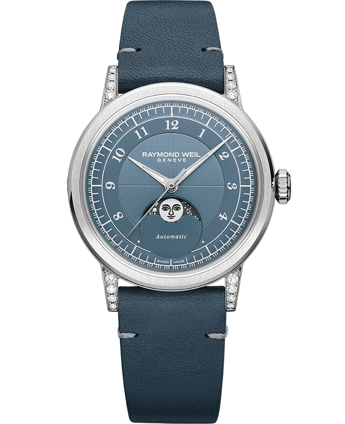Raymond Weil has introduced the Millesime Automatic Moon Phase watch, featuring a 35mm stainless steel case and a denim blue sector dial adorned with Super-Luminova® Arabic numeral indexes. This timepiece is powered by the RW4280 mechanical self-winding movement, offering a 41-hour power reserve. Notably, the dial showcases a moon phase complication at 6 o’clock, adding a touch of elegance. The watch is complemented by a navy blue genuine calf leather strap and is water-resistant up to 50 meters.