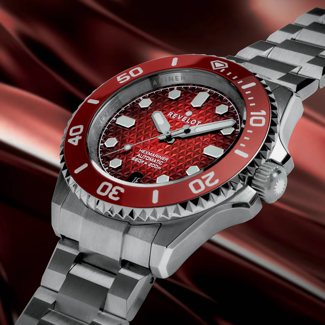 Drawing from iconic inspiration and adding a modern twist, the Hexmariner 39 by Revelot is set to capture attention. This timepiece reimagines a classic design with sharp, angular edges and hexagonal details, presenting a bold, industrial aesthetic. The case features a unidirectional ceramic bezel with C3/BGW9 Swiss Super-LumiNova® and an anti-reflective sapphire crystal, while the dial options include mother-of-pearl or lapis lazuli for a unique look. Powered by a reliable Seiko NH35 movement, the Hexmariner 39 offers both functionality and distinct style.