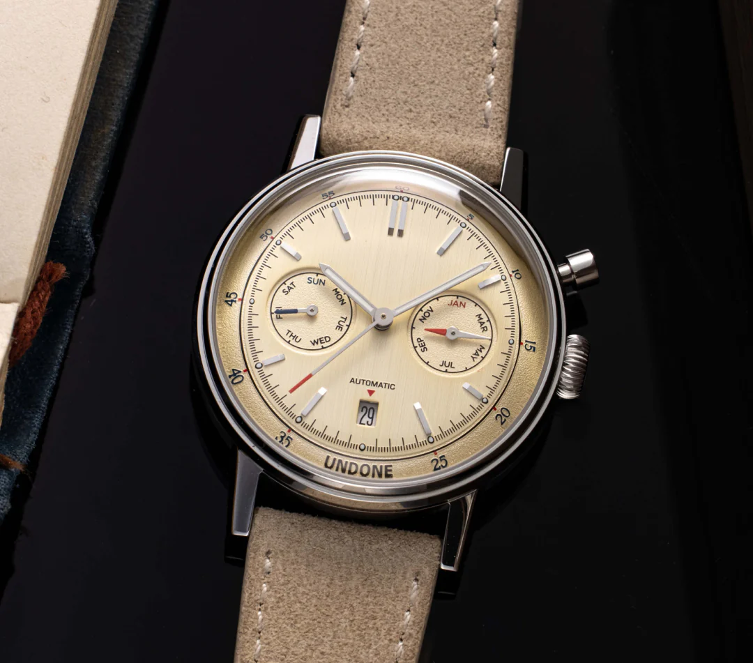 UNDONE’s first Urban Automatic brings a vintage aesthetic to modern-day functionality with a seamless blend of style and mechanics. Its standout feature is the integration of dual subdials displaying the day and month—marking the brand’s innovation in the Urban family collection. Crafted from durable 316L stainless steel with a fixed bezel and sapphire glass, this 40mm timepiece is powered by the reliable Miyota 9122 automatic movement and offers 100 meters of water resistance. Available in two versatile colors, this release is poised to make a mark.