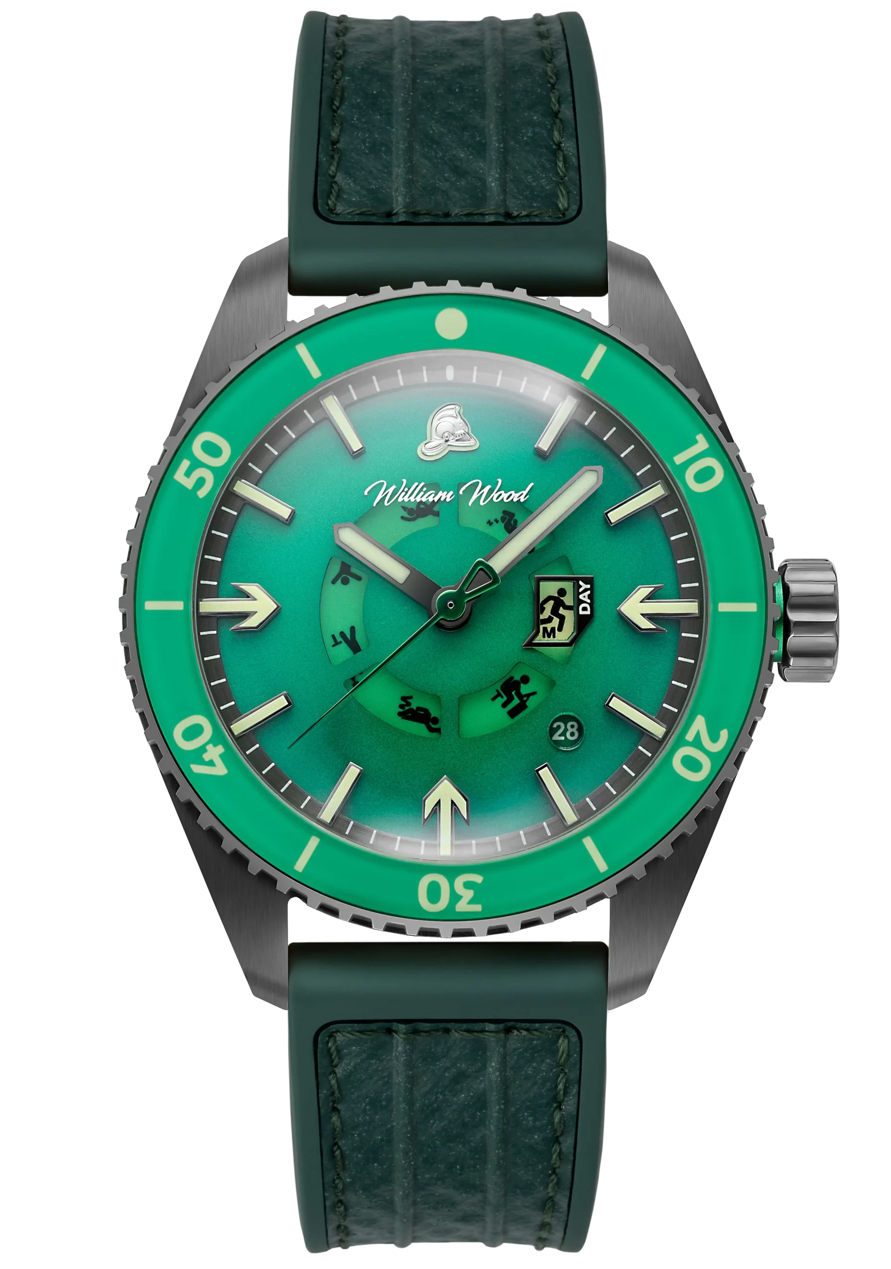 Drawing inspiration from 20th-century military dive watches, the Fire Exit Watch by William Wood combines vintage design with modern robustness. This limited edition timepiece features a 41mm 316L stainless steel case, sapphire crystal, and a unique caseback with a dynamic animation. Powered by a Swiss-Made Sellita SW220 movement, it offers a 41-hour power reserve and 100M water resistance. The watch’s green glass dial and custom buckle evoke the aesthetics of a fire exit sign.
