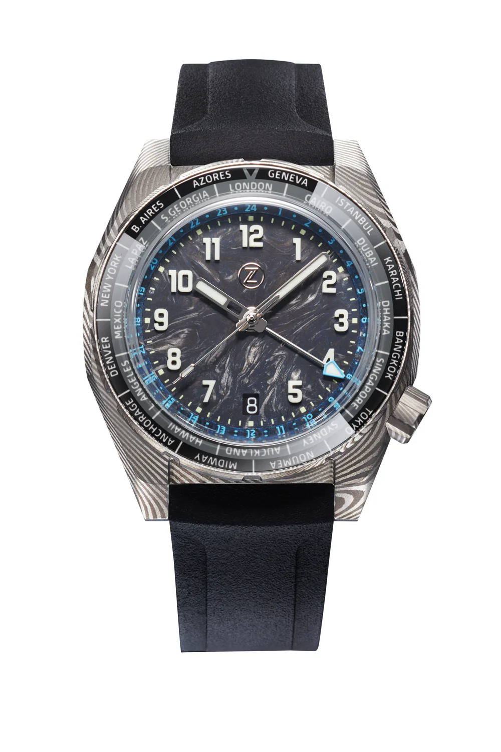 Zelos presents the Thresher 41mm Damascus Limited Edition, a timepiece that stands out with its Damascus stainless steel case, featuring a unique woodgrain pattern. This distinctive watch is powered by the Miyota 9075 ‘True’ GMT movement and includes a 48-click bi-directional bezel with a sapphire insert. The lumed carbon dial enhances visibility in the dark, while the 200m water resistance and FKM strap with a Damascus buckle ensure durability. Limited and individually patterned, each watch is truly one-of-a-kind.